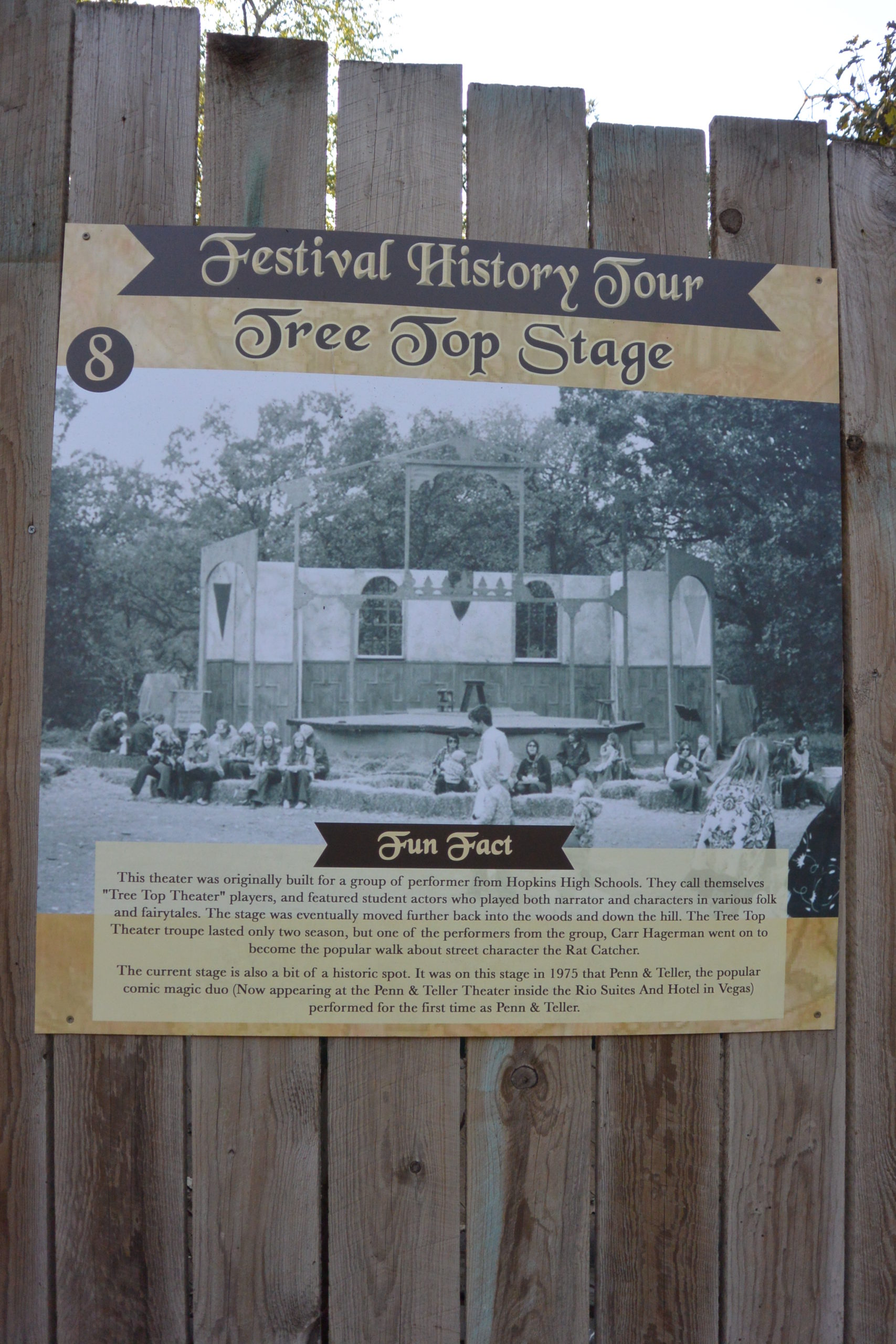 This theater was originally built for a group of performers from Hopkins High Schools. They call themselves “Tree Top Theater” players, and featured student actors who played both narrator and characters in various folk and fairytales. The stage was eventually moved further back into the woods and down the hill. The Tree Top Theater troupe lasted only two seasons, but one of the performers from the group, Carr Hagerman went on to become the popular walk about street character the Rat Catcher